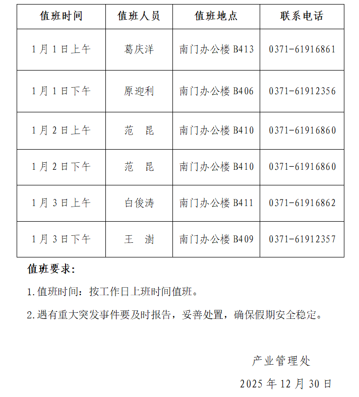 产业管理处2026年元旦假期值班表